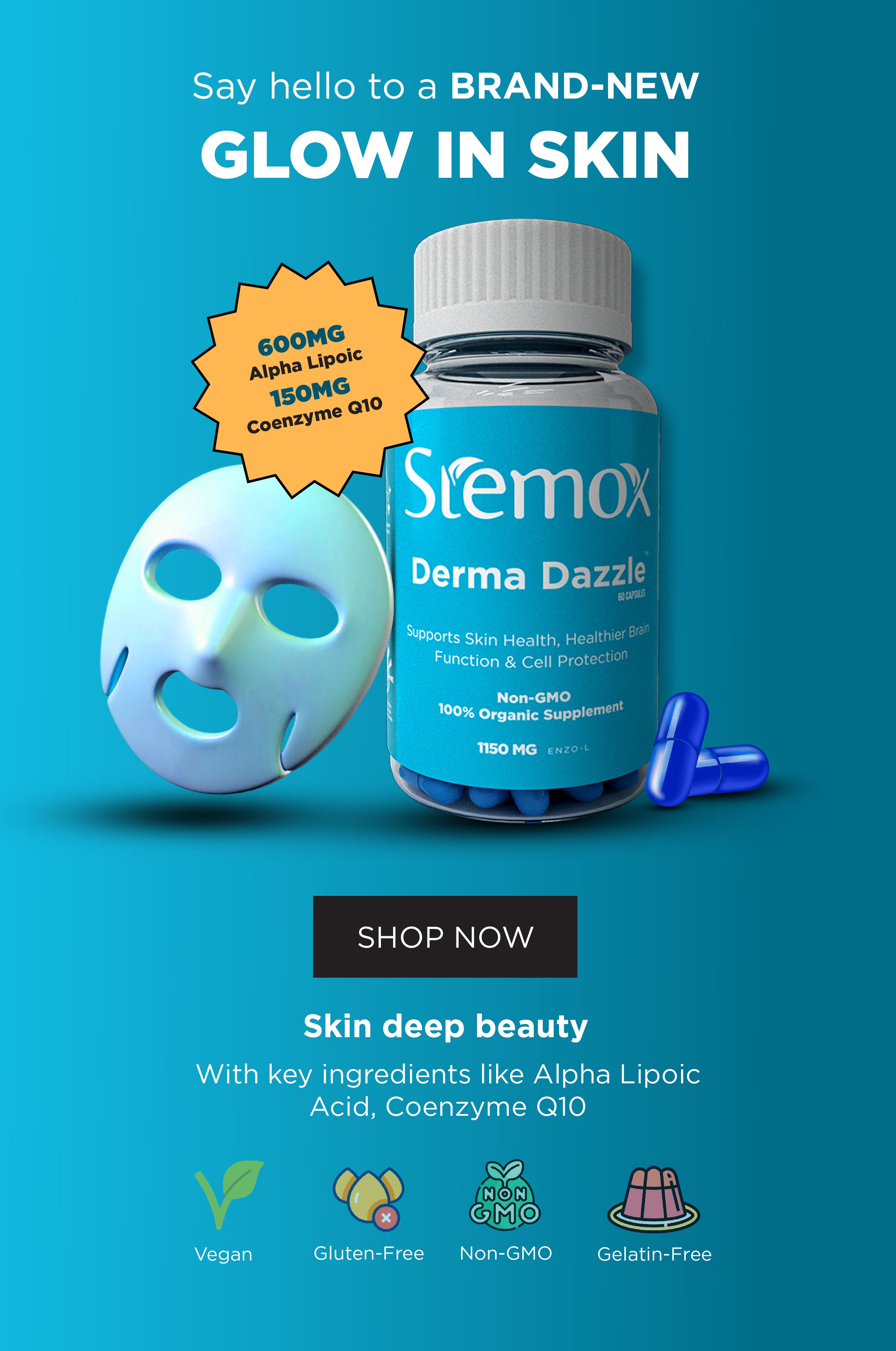 Stemox Derma Dazzle is a powerful 1150mg anti-aging supplement that supports skin health, healthier brain function, and cell protection using Alpha Lipoic Acid (600mg) and Coenzyme Q10 (150mg) to fight wrinkles and promote radiant skin from within.