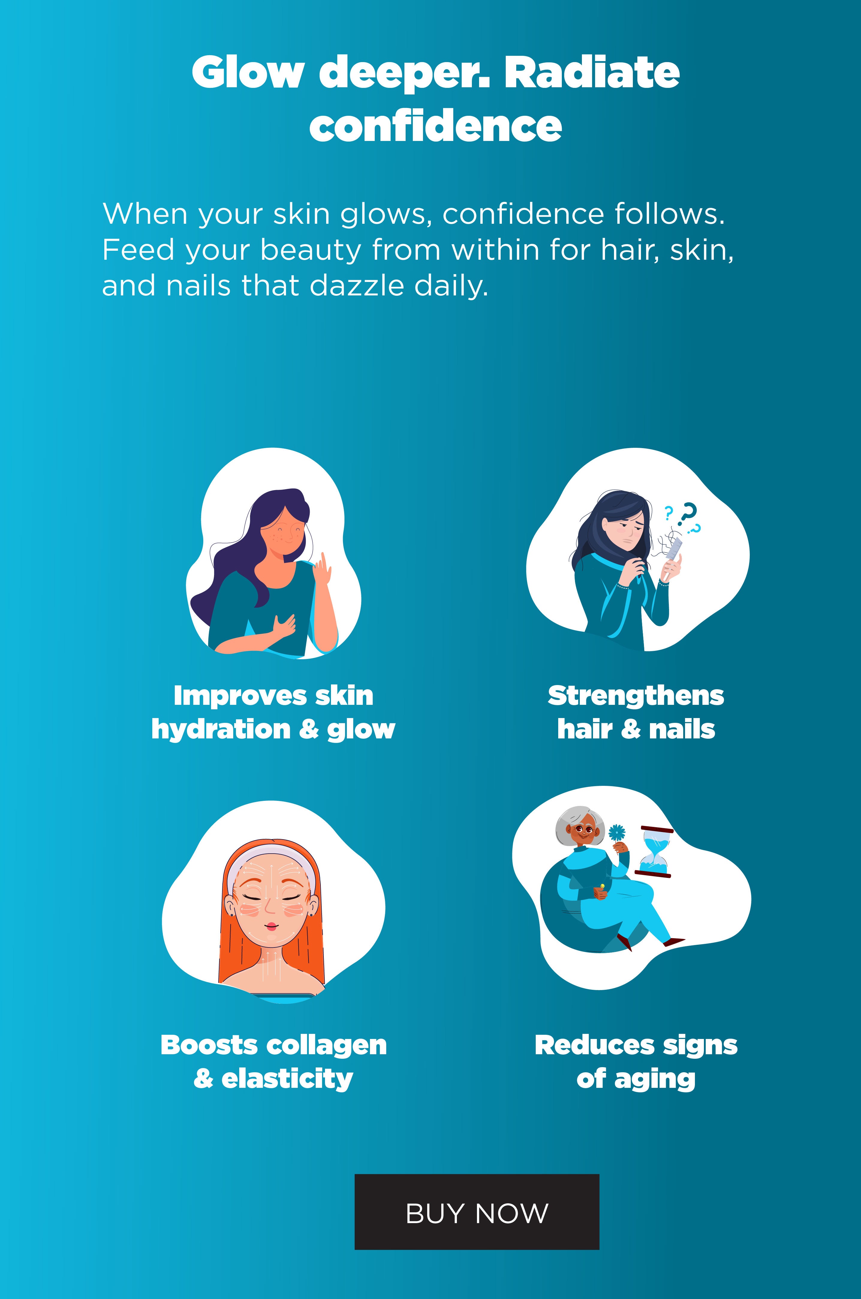 Derma Dazzle provides potent antioxidants that protect cells from damage, boost collagen production, reduce fine lines and wrinkles, improve skin elasticity, and support cellular regeneration for youthful, glowing skin and optimal brain health.
